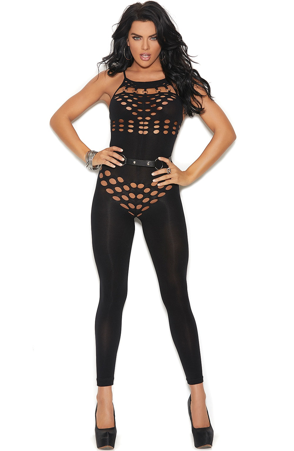 Opaque halter neck bodystocking is crotchless and prepared for your body babe. Cut out detailing gives spicy look. Black footless bodystocking is available also in plus size.