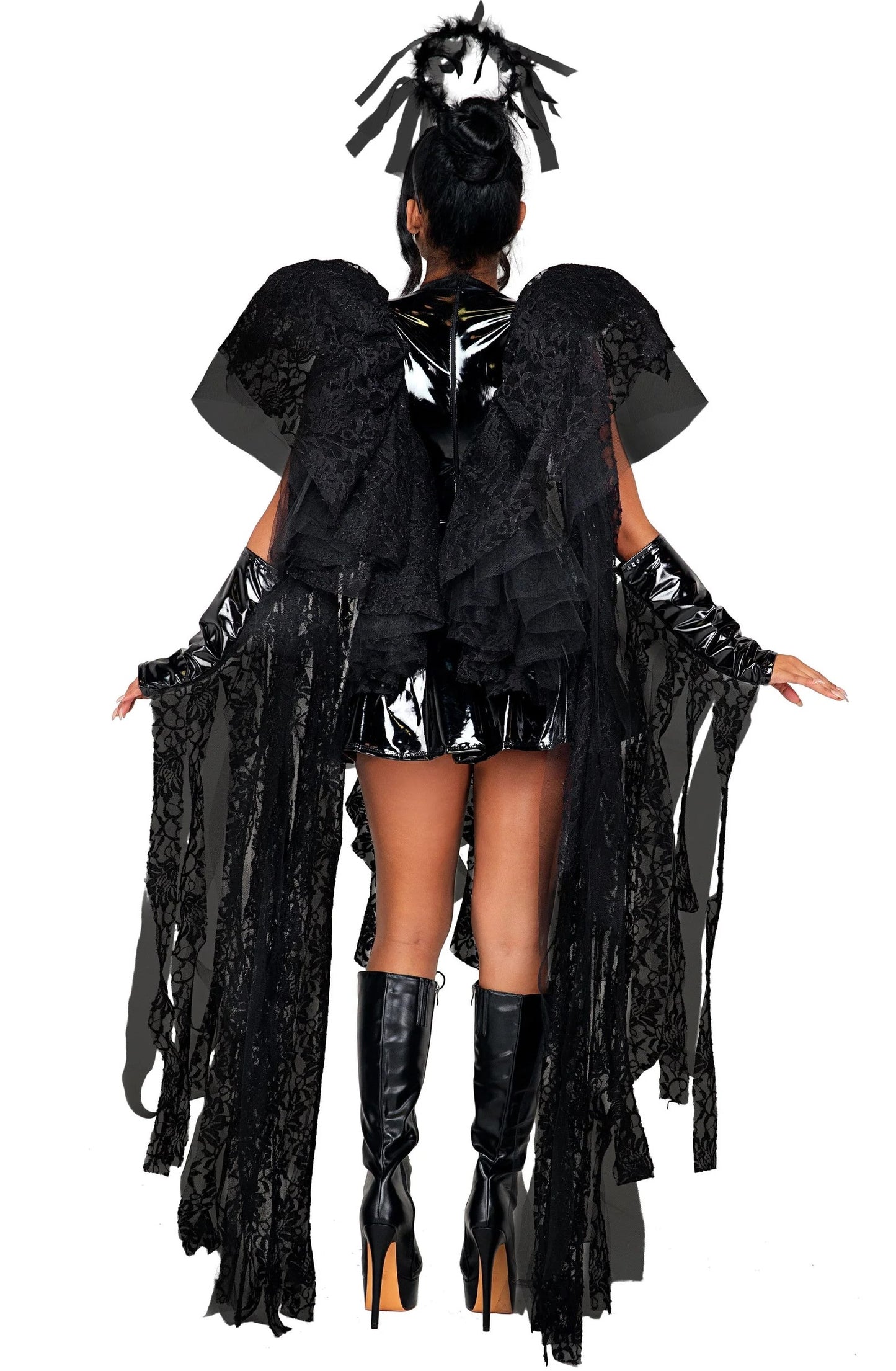 The Angel of Darkness costume from SexyLingerieLand is a stunning and unique look for any special occasion. The vinyl dress features distressed lace detail and built-on wings for a truly angelic look. The costume also includes gloves, a belt, and a headpiece to complete the look. This costume is perfect for Halloween, costume parties, or any other special event.