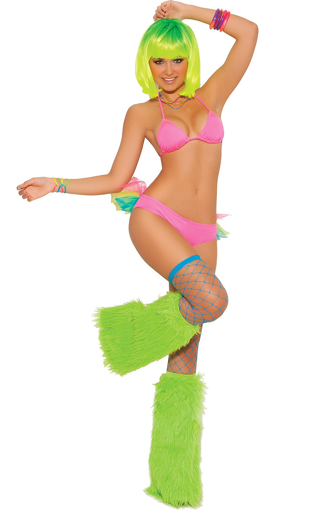 Lycra neon pink gogo set. Features tutu panty and bikini bra. Model is made of soft materials. Perfect outfit for women gogo dancers.