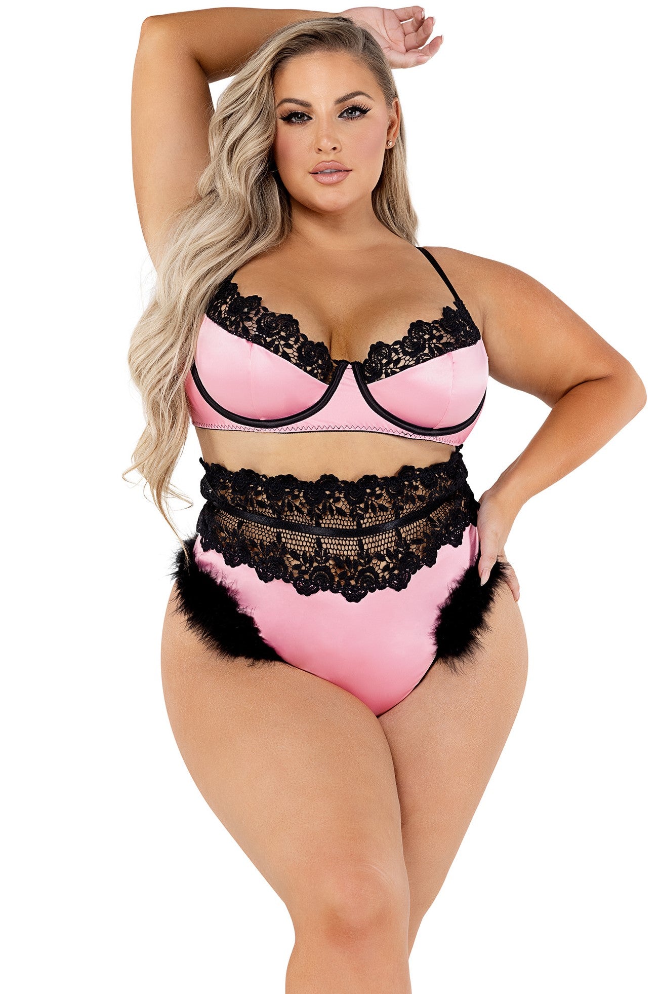 Beautiful embroidery & satin bralette lingerie. Bralette lingerie in pink black color combination features bralette top with underwire support. Straps are adjustable, hook & eye back closure. High-waisted shorts included. Plussize is available.