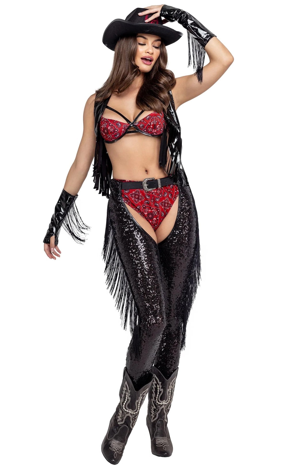 The Saddle up CowGirl costume is the perfect choice for a wild night out. This costume includes a vinyl vest, paisley bra, paisley shorts, belt, sequin chaps with fringe, and gloves with fringe. It's sure to make you stand out in the crowd. The vinyl vest is designed to fit snugly and provide a comfortable fit. The paisley bra and shorts are made from a lightweight fabric that is both stylish and comfortable. The belt adds a touch of western flair, while the sequin chaps with fringe and gloves with fringe complete the look.