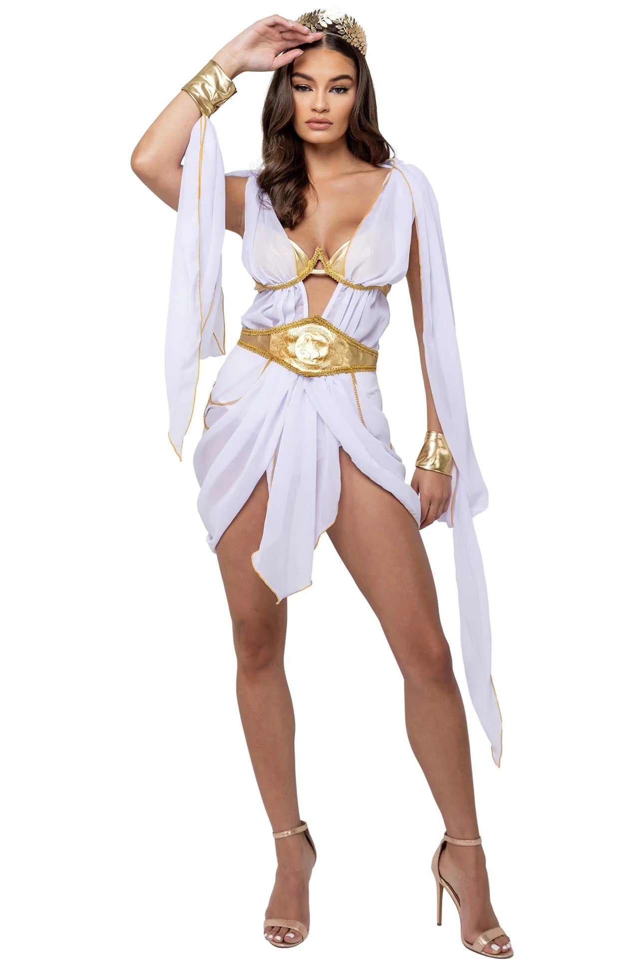 The Sultry Goddess costume from SexyLingerieLand is a stunning ensemble that will make you feel like a goddess. The costume includes a bodysuit with cuffs and built-in bra, a belt, and a headpiece. The bodysuit is made of a soft and comfortable fabric that will hug your curves and make you feel beautiful. The belt and headpiece add a touch of elegance and complete the look.
